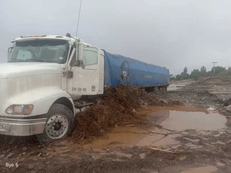 Las lluvias copadas dejaron un camión empantanado en medio de una creciente feroz en Divisadero, Sarmiento. Maquinaria pesada está dándole batalla para rescatarlo y limpiar la zona.