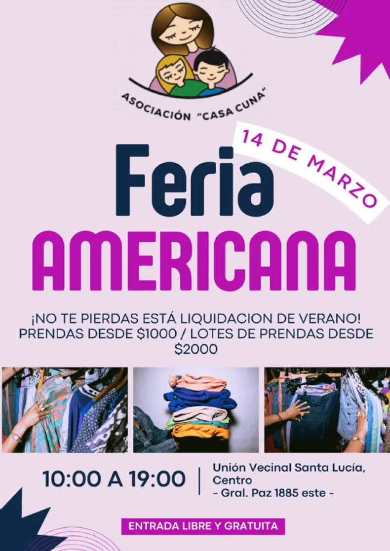 Este 14 de marzo, en la Unión Vecinal de Santa Lucía (Gral. Paz 1885 Este) se realizará una Feria Americana en beneficio de Casa Cuna, en donde podrás comprar, ahorrar y ayudar.