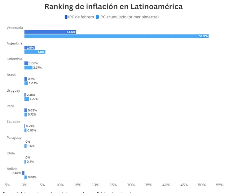 Para tener un panorama claro, el ranking que compartió Infobae lo bajó en orden: primero Venezuela, con una inflación de febrero del 14,60% y un bimestre acumulado que tocó el 51,90%. Este descontrol de dos dígitos mensuales refleja la compleja situación macroeconómica que sobrevuela en ese país hermano.