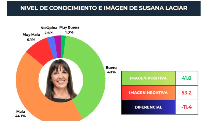 En el corazón de la Capital sanjuanina, un informe que no deja lugar a dudas retrata una realidad política bien movida para Susana Laciar. Según el relevamiento, realizado presencialmente entre el 9 y el 12 de marzo de 2026 con 716 casos, la intendenta sigue sumando seguidores, pero el rechazo la supera: un 42% la banca, pero el 53,2% la mira con desconfianza y crítica, dejando un saldo negativo que no es poca cosa, con más de 11 puntos de diferencia.