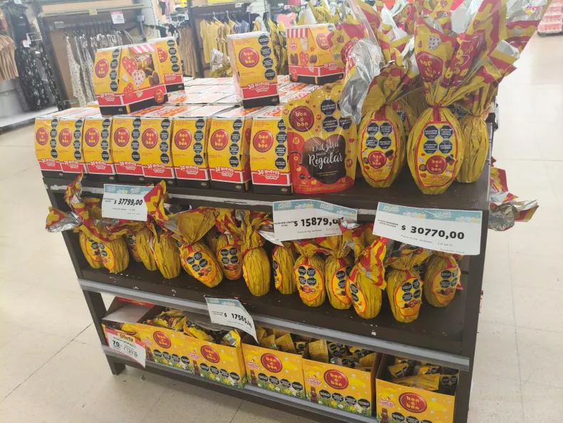 En la franja más accesible, los huevos industriales chicos, de entre 70 y 100 gramos, se consiguen desde los $7.000 y pueden llegar a los $12.000. Después aparecen los de gama media, que rondan entre 150 y 200 gramos, con valores que van de $18.000 a $35.000, sobre todo en marcas conocidas como Kinder o Milka. Ahí ya se nota que la Pascua no sale barata.