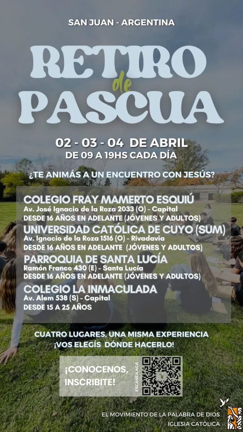 A una semana de arrancar, el Retiro de Pascua 2026 ya empieza a mover a la comunidad sanjuanina. La propuesta apunta a quienes quieran vivir unos días de fe, reflexión y encuentro en plena Semana Santa. Serán tres jornadas intensas, con un clima pensado para compartir y renovar el espíritu.