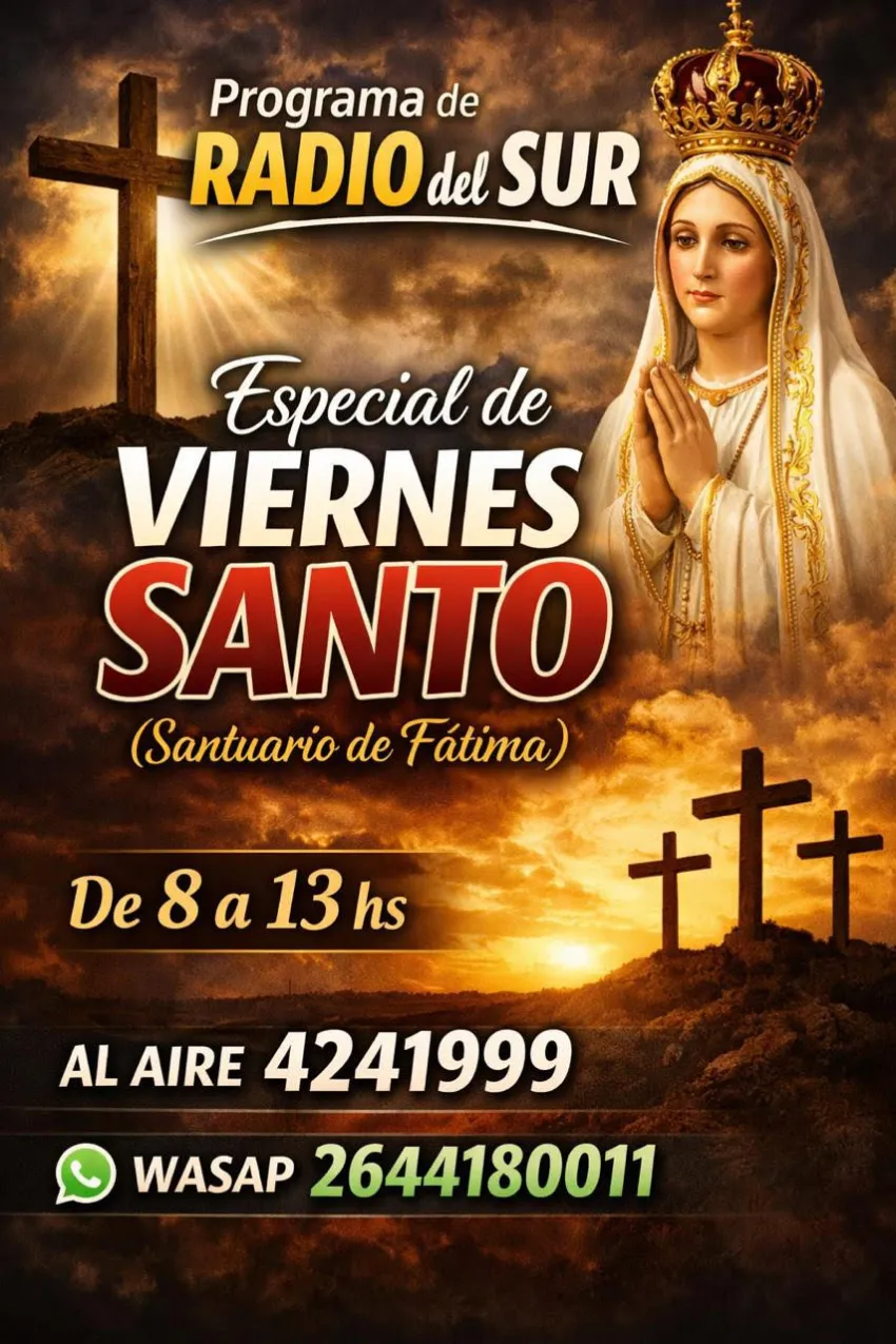 Como cada año, desde Radio del Sur nos unimos a la conmemoración del Viernes Santo con un programa especial, dedicado a la reflexión y espiritualidad. Bajo la conducción de Nancy Morfil, te invitamos a acompañarnos en este camino de fe y reflexión, transmitido en vivo.