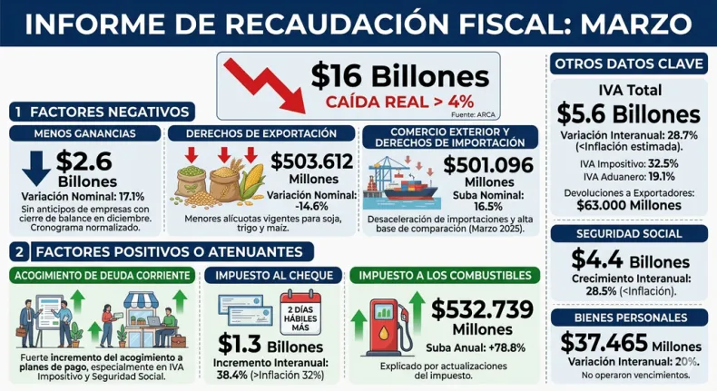 La recaudación de marzo cerró con un sabor amargo para las cuentas públicas: ARCA informó ingresos por $16 billones, pero con una baja real de algo más del 4%. En la foto nominal, el número parece más robusto, con una suba interanual del 26,2%, aunque la inflación terminó licuando buena parte del avance. En el acumulado del primer trimestre, el fisco juntó $50,5 billones, con un alza del 22,7%.