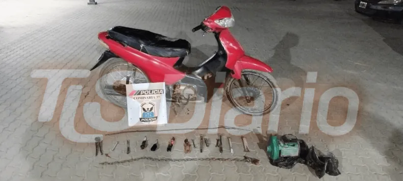 Al revisar la moto, una Zanella ZB 110cc roja, con dominio 719 IQV, constataron que tenía prohibición de circular y que estaría vinculada a un propietario con domicilio en el barrio Los Médanos, en Rawson. Pero lo más pesado apareció al mirar adentro: en la cajuela había una bomba de agua, puntas de hierro, cadenas con candado, cuchillos tipo punta, un cuchillo de cocina, tijeras de podar, una tenaza y llaves para tuercas, entre otros elementos.