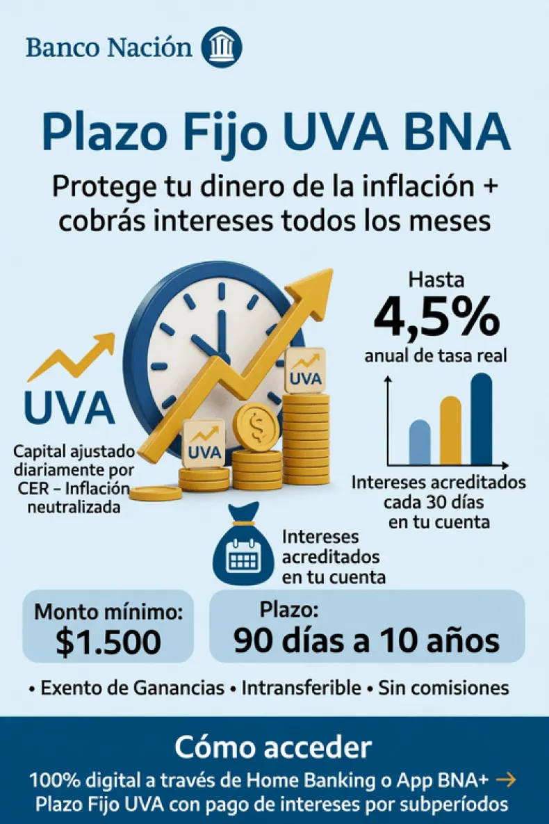 La operatoria es completamente digital y no tiene costos de mantenimiento ni comisiones. Se puede hacer desde Home Banking, entrando en la opción "Plazo Fijo UVA con pago de intereses por subperíodos", o desde la app BNA+, en el menú "Inversiones" y luego "Plazo Fijo". Una salida simple para quienes quieren poner a trabajar sus pesos sin moverse de casa.