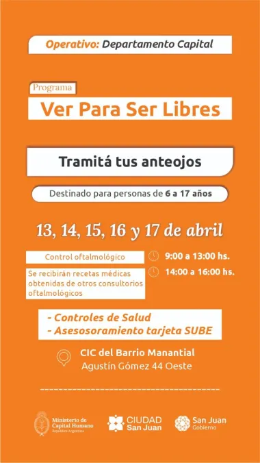 La Municipalidad de la Ciudad de San Juan informa a la comunidad que se extendió el operativo gratuito de salud visual y abordaje integral, que se desarrollará del 13 al 17 de abril en el CIC del barrio Manantial, en el sector de Trinidad.