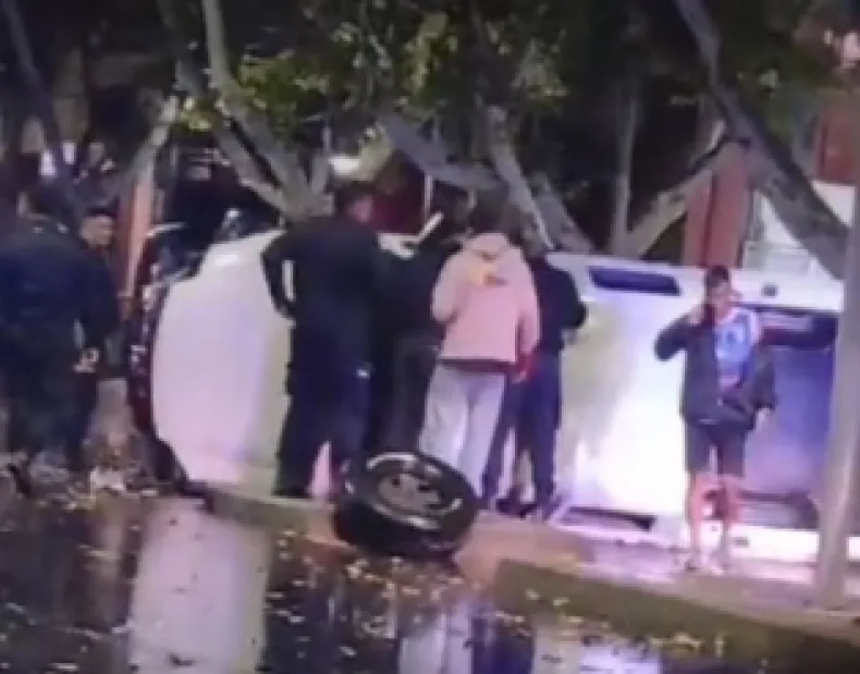 La madrugada de este sábado arrancó movida en San Juan, cuando un automóvil terminó volcado sobre Avenida Libertador General San Martín, a metros de la esquina con Paula Albarracín de Sarmiento, en Capital. La lluvia caía con fuerza y, según se pudo ver en la zona, las condiciones de manejo estaban bastante complicadas. El vehículo quedó dado vuelta sobre la calzada y generó una escena que llamó la atención de todos los que pasaban por ahí.
