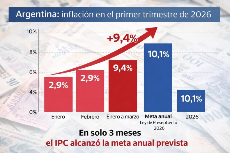 Con el 3,4% de marzo sumado al 2,9% de enero y al 2,9% de febrero, la inflación del primer trimestre ya trepó al 9,4%. En apenas tres meses, el Índice de Precios al Consumidor (IPC) quedó a un paso de consumir casi toda la meta anual que figura en la Ley de Presupuesto 2026, donde se había fijado un 10,1% para todo el año. La distancia entre lo que esperaba el Gobierno y lo que pasa en la calle, a esta altura, ya es enorme.