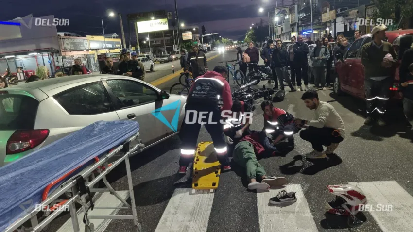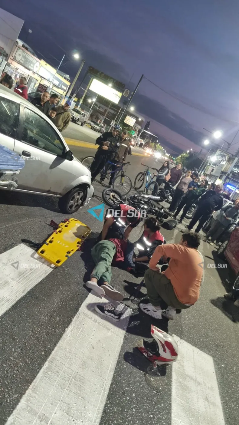 Un aparatoso siniestro vial generó conmoción en la intersección de calles España y República del Líbano, en Rawson, donde una motocicleta fue impactada de manera violenta por un automóvil.