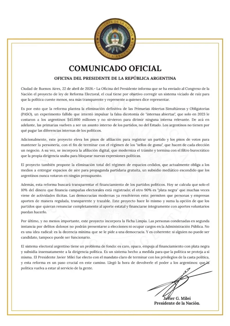 Uno de los puntos que más ruido hace es la eliminación de las PASO. La propuesta plantea que los partidos dejen de usar ese mecanismo financiado por el Estado para definir candidaturas y pasen a resolver sus internas puertas adentro. Desde el Ejecutivo sostienen que así se achica el gasto público y se evita que la gente termine pagando disputas partidarias.