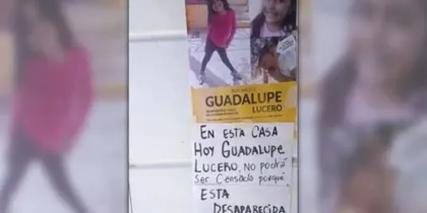 En la mañana de este miércoles, Yamila Cialone, madre de la niña, compartió en sus redes sociales una foto de la entrada de su domicilio donde se puede observar un cartel que le dejó al censita haciendo mención a la desaparición de la nena como forma de continuar visibilizando la búsqueda. ¿Qué decía? "En esta casa hoy Guadalupe Lucero no podrá ser censada porque está desaparecida. ¿Dónde está Guada?".