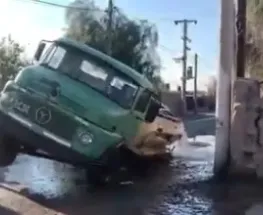 Un camión cisterna quedó atrapado en el pavimento que cedió en la intersección de calles Flores y Octavio Gil, generando un verdadero caos entre los vecinos y transeúntes.